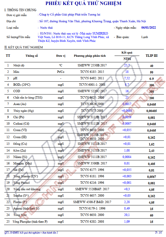 Chất lượng nước đầu ra: TLIP III - Vĩnh Phúc.